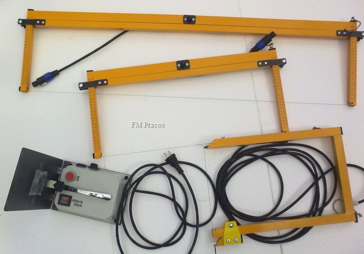 Zařízení je sestaveno ze zdroje s naklápěcí vodící lištou a tří nástavců pro řezání ploten až do rozměru 100 x 100 a síle max. 20 cm a je vybaveno tepelnou ochranou, která po event. přehřátí a vypnutí, znovu po vychladnutí zařízení automaticky sepne.