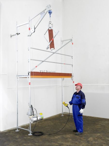 Lešenářský vrátek výrobce GEDA mini 60S je osvědčený vrátek pro lešenáře s lanem o délce 51 m a ovládáním 10 m. Pohonná jednotka se jednoduchým způsobem upevní dole na lešení a při stavbě nebo bourání lešení stačí umístit rameno s kladkou na nejvyšší patro lešení.