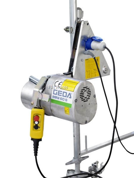 Lešenářský vrátek výrobce GEDA mini 60S je osvědčený vrátek pro lešenáře s lanem o délce 81 m a ovládáním 10 m. Pohonná jednotka se jednoduchým způsobem upevní dole na lešení a při stavbě nebo bourání lešení stačí umístit rameno s kladkou na nejvyšší patro lešení.